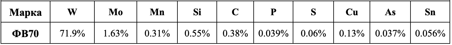 Ферровольфрам ФВ70 — это сплав железа (Fe) и вольфрама (W), содержащий около 70% вольфрама. Он используется в металлургии для легирования сталей и сплавов с целью повышения их прочности, износостойкости и термостойкости. Основные характеристики ФВ70: