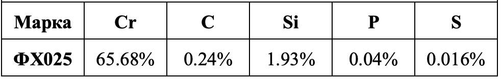 Феррохром ФХ025 — это высокоуглеродистый феррохромовый сплав с пониженным содержанием хрома (около 25-30% Cr) и высоким содержанием углерода (обычно 6-8% C). Это один из самых дешевых и наименее легированных видов феррохрома, используемый в специфических областях металлургии. 1. Основные характеристики ФХ025