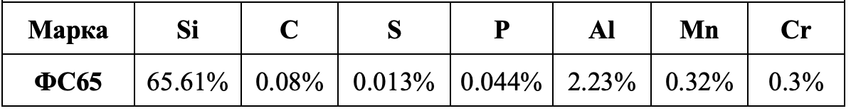 Ферросилиций ФС65 — это железокремнистый сплав с содержанием кремния (Si) 63–68%и железа (Fe) ~30%, применяемый в металлургии для раскисления и легирования сталей и чугунов. Основные характеристики (ГОСТ 1415-93):