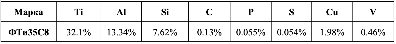 Ферротитан ФТи35С8 — это экономичный ферросплав на основе железа и титана с содержанием титана 30-40% и повышенным содержанием кремния (7-9%). Используется преимущественно в чугунолитейном производстве и для раскисления рядовых сталей. Технические характеристики