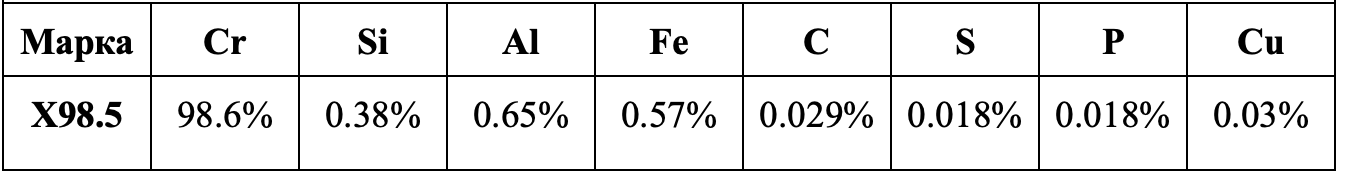 Металлический хром Х98.5 — это технический сорт хрома с содержанием основного вещества не менее 98,5%. Данная марка представляет собой экономичный вариант металлического хрома, который находит применение в различных отраслях промышленности, где допустимо несколько повышенное содержание примесей по сравнению с более чистыми марками (Х99 и выше). Основные характеристики: Физические свойства:
