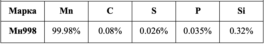 Марганец металлический Мн998 — это высокочистый марганец с содержанием основного вещества не менее 99,8%. Используется в особо ответственных отраслях промышленности, где требуются исключительная чистота и стабильные свойства материала. Основные характеристики: